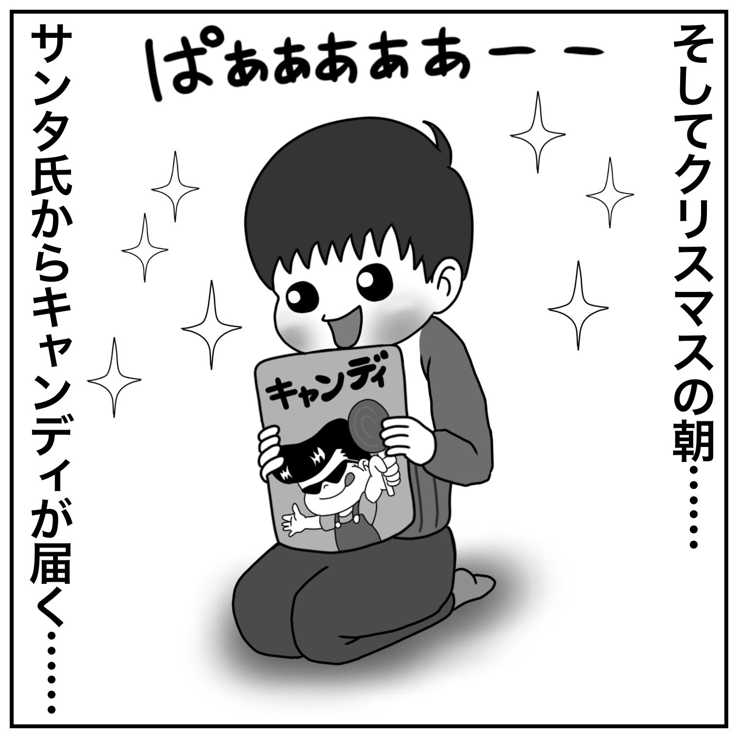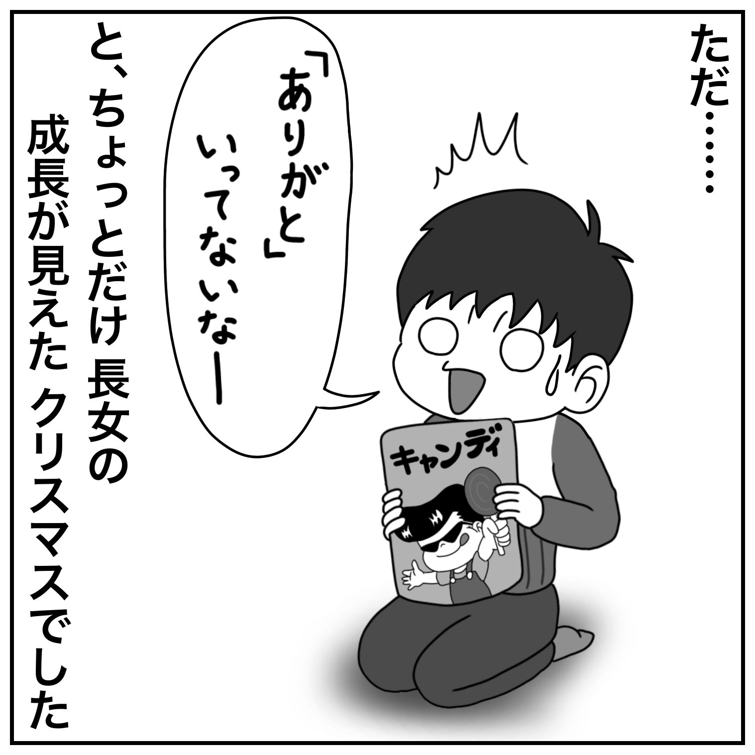 サンタからのプレゼント2021.06.10育児絵日記 はいどーも、ぢょにーです。今回のおはなしは長女が2歳の時のクリスマスのエピソード。季節外れなおはなしですが、ご勘弁を……あとがきキャンディのパッケージはもちろんテキトーです。 おまけネタちょうどその頃に起きた出来事です。この頃ちょうど『今日から俺は』が流行っていたせいか、酔っ払った若いのにおちょくられました…… 12 コメントはこちら 同じカテゴリの記事 エレベーター evolution2 夢…… 片付け‼︎‼︎‼︎‼︎ 過去の写真…… 大工さん♡ 夏の小ネタ集 その③ 夏の小ネタ集 その① 夏休みの朝 2025 絵の宿題 みんな見て〜♡ ニイニイゼミ にゅーどーぐも 夕飯前のお散歩 クワガタ? せいっ‼︎ ピアノが弾きたい母ちゃん 名前を変えたい…… 母の日♡ 子ネコの名前は? 末っ子の落書き 次女の卒園 エレベーター 梅の花 桜の花 手話…… 節分祭 今年のスケジュール 落とし物 我が家の成長記録日記 末っ子のニガテなもの 父の強さ…… 飛蝗 漢字の宿題 ハロウィン 2024 自分で捕れた虫 姉妹漫才? 父の教え 夏休み 終わりました 夏休みの朝は… 虫捕りと長女 自転車となつ 商店街のくじ引き 思わぬところからクレームが… 衣装ケースに隠した物… 輪ゴムてっぽう 父ちゃんの歌…… 次女のうた…… お姉ちゃんやめたい 戦いごっこの末に 節分の鬼 生まれた理由 寝正月……? クリスマスイブの夜 おんぶ DE 登園 なつは夏が大好き いってきま〜す ハロウィン 次女のお絵描き…… 下校時のお花摘み 『ち◯こ』がオモロいお年頃 おしりの違和感 その② 町内の親睦会で…… 好みの変化 夏の思い出 父のセミ講座 お月さま クワガタ捕り ラジオ体操 2023 『ただいま』『おかえり』 山口県のお土産 プリンセスごっこ・リターンズ 獅子舞となつ 入園式の日には…… 一年生終わりました…… 特にオチのない身の上ばなし 小児科にスズメバチの巣? ラジオ体操と次女 おしりの違和感 次女の算数 ひき算がニガテ あの時期に突入…… 初めてのケーキ 仕事の休憩中なんですが…… 初めての轟音に…… 園芸コーナーのお買い物 娘たちの怖いもの 子供に気を取られて…… きょうだい喧嘩 長女のランドセル 最後の登園 朝の不思議 長女の誕生日プレゼント 次女の推しアニメ 我が家でクラスター発生⁉︎ その② 我が家でクラスター発生⁉︎ 2021年 終了 練習不足の発表会♨︎ 次女 鎖骨骨折……③ 次女 鎖骨骨折② 『病児保育』の申請 次女 鎖骨骨折……① ザンネンなお知らせ…… 寝かしつけ その② 寝かしつけ 娘の運動会 近所の飲み屋さん ごはんハプニング【大惨事編】 ごはんハプニング【序の口編】 お姫さまならぬ『おしめさま』 あの有名ロボット…… カブトムシのお世話 我が家の夏の風物詩 家の中 探検家 プリンセスごっこ 次女の誕生日プレゼント その② 次女のお誕生日プレゼント その① 姉妹げんか 姉の仕返し なんの音? 我が家の次女ちゃん⑤ ぬいぐるみがほしい 長い髪を目指して…… 我が家の次女ちゃん④ 消えた洗濯物 我が家の次女ちゃん② ③ 花の咲く頃…… 鬼滅ブーム その③ 損な役回り その② 父のお留守番…… はじめてのお誕生日プレゼント 我が家の次女ちゃん はじめてのヘアゴム 長女のあこがれ クリスマスの朝…… 深夜の事件…… 鬼滅ブーム おまけ話 おむつ交換 リターンズ 鬼滅ブーム その② 鬼滅ブーム おむつ交換 ① ② カミさんが家からいなくなった……エピローグ【3人目誕生編②】 カミさんが家からいなくなった……エピローグ【3人目誕生編①】 カミさんが家からいなくなった……11 【がんばった小さな姉妹】 カミさんが家からいなくなった……⑩ 休日の子守り カミさんが家からいなくなった……⑨ 【最強?の助っ人】 カミさんが家からいなくなった……⑧ 【かーちゃんに会いたい】 カミさんが家からいなくなった…… ⑦ 【久々のかーちゃん】 カミさんが家からいなくなった……⑥ 【みんなに感謝】 カミさんが家からいなくなった……⑤ 【温かいごはん】 カミさんが家からいなくなった……④ 【切迫早産】 カミさんが家からいなくなった……③ 【深夜の容態異常】 カミさんが家からいなくなった……② 【安産のジンクス】 カミさんが家からいなくなった…… いやいや期突入 次女の夜泣き 次女の性格が見え始めた まだ小さいお姉ちゃん…… 四つ葉のクローバー その⑤ 四つ葉のクローバー その④ 四つ葉のクローバー その③ 四つ葉のクローバー その② 四つ葉のクローバー 一番星みつけた おもちゃのテントの中に…… 朝のトイレで 次女との買い物で…… マスク作り こたつたこ コルク栓 忘れ物 その② 忘れもの…… 寒い日の朝に オムツ交換 くじ運の強さ その② 言葉がわかってきた☀︎ ゾウさんのすべり台 final 見せて〜 ご機嫌ナナメの原因は…… ゾウさんのすべり台 その⑤ 娘と手遊び オレが二人いたら…… 飲み屋街が近いと…… ゾウさんのすべり台 その④ ゾウさんのすべり台 その③ 忘れ物 こっそり飲みに……その③ 