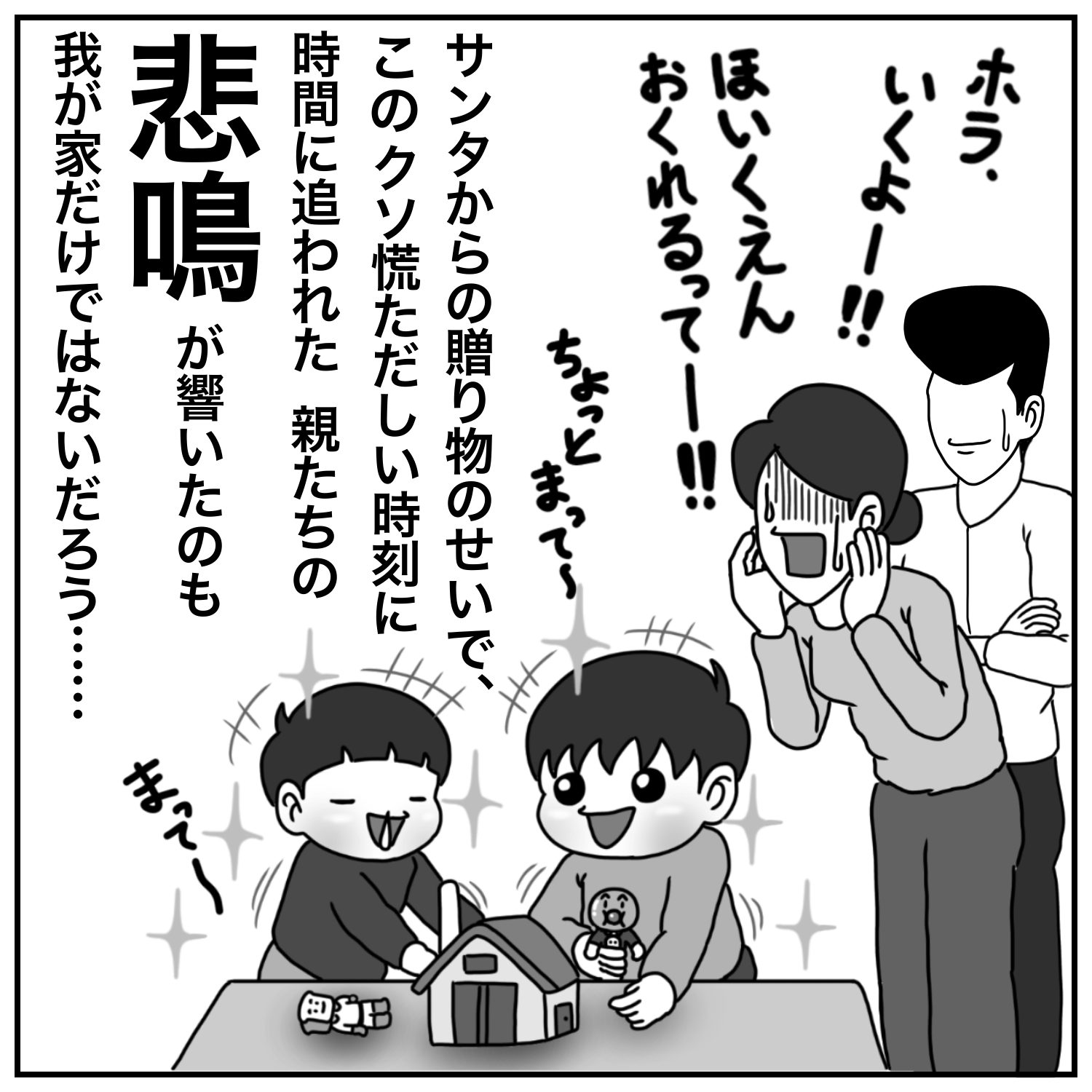 クリスマスの朝……2021.11.01育児絵日記 はいどーも、ぢょにーです。今回のおはなしは、ちょっと季節的には早いですが、去年のクリスマスの朝のおはなし………… あとがきほんとクリスマスって第四日曜とかになってくれないかな…………そうすればちびっ子たちもプレゼントをゆっくり堪能できるのに♨︎ 18 コメントはこちら 同じカテゴリの記事 エレベーター evolution2 夢…… 片付け‼︎‼︎‼︎‼︎ 過去の写真…… 大工さん♡ 夏の小ネタ集 その③ 夏の小ネタ集 その① 夏休みの朝 2025 絵の宿題 みんな見て〜♡ ニイニイゼミ にゅーどーぐも 夕飯前のお散歩 クワガタ? せいっ‼︎ ピアノが弾きたい母ちゃん 名前を変えたい…… 母の日♡ 子ネコの名前は? 末っ子の落書き 次女の卒園 エレベーター 梅の花 桜の花 手話…… 節分祭 今年のスケジュール 落とし物 我が家の成長記録日記 末っ子のニガテなもの 父の強さ…… 飛蝗 漢字の宿題 ハロウィン 2024 自分で捕れた虫 姉妹漫才? 父の教え 夏休み 終わりました 夏休みの朝は… 虫捕りと長女 自転車となつ 商店街のくじ引き 思わぬところからクレームが… 衣装ケースに隠した物… 輪ゴムてっぽう 父ちゃんの歌…… 次女のうた…… お姉ちゃんやめたい 戦いごっこの末に 節分の鬼 生まれた理由 寝正月……? クリスマスイブの夜 おんぶ DE 登園 なつは夏が大好き いってきま〜す ハロウィン 次女のお絵描き…… 下校時のお花摘み 『ち◯こ』がオモロいお年頃 おしりの違和感 その② 町内の親睦会で…… 好みの変化 夏の思い出 父のセミ講座 お月さま クワガタ捕り ラジオ体操 2023 『ただいま』『おかえり』 山口県のお土産 プリンセスごっこ・リターンズ 獅子舞となつ 入園式の日には…… 一年生終わりました…… 特にオチのない身の上ばなし 小児科にスズメバチの巣? ラジオ体操と次女 おしりの違和感 次女の算数 ひき算がニガテ あの時期に突入…… 初めてのケーキ 仕事の休憩中なんですが…… 初めての轟音に…… 園芸コーナーのお買い物 娘たちの怖いもの 子供に気を取られて…… きょうだい喧嘩 長女のランドセル 最後の登園 朝の不思議 長女の誕生日プレゼント 次女の推しアニメ 我が家でクラスター発生⁉︎ その② 我が家でクラスター発生⁉︎ 2021年 終了 練習不足の発表会♨︎ 次女 鎖骨骨折……③ 次女 鎖骨骨折② 『病児保育』の申請 次女 鎖骨骨折……① ザンネンなお知らせ…… 寝かしつけ その② 寝かしつけ 娘の運動会 近所の飲み屋さん ごはんハプニング【大惨事編】 ごはんハプニング【序の口編】 お姫さまならぬ『おしめさま』 あの有名ロボット…… カブトムシのお世話 我が家の夏の風物詩 家の中 探検家 プリンセスごっこ 次女の誕生日プレゼント その② 次女のお誕生日プレゼント その① 姉妹げんか 姉の仕返し なんの音? 我が家の次女ちゃん⑤ ぬいぐるみがほしい 長い髪を目指して…… 我が家の次女ちゃん④ 消えた洗濯物 我が家の次女ちゃん② ③ 花の咲く頃…… 鬼滅ブーム その③ 損な役回り その② 父のお留守番…… はじめてのお誕生日プレゼント 我が家の次女ちゃん はじめてのヘアゴム 長女のあこがれ クリスマスの朝…… 深夜の事件…… 鬼滅ブーム おまけ話 おむつ交換 リターンズ 鬼滅ブーム その② 鬼滅ブーム おむつ交換 ① ② カミさんが家からいなくなった……エピローグ【3人目誕生編②】 カミさんが家からいなくなった……エピローグ【3人目誕生編①】 カミさんが家からいなくなった……11 【がんばった小さな姉妹】 カミさんが家からいなくなった……⑩ 休日の子守り カミさんが家からいなくなった……⑨ 【最強?の助っ人】 カミさんが家からいなくなった……⑧ 【かーちゃんに会いたい】 カミさんが家からいなくなった…… ⑦ 【久々のかーちゃん】 カミさんが家からいなくなった……⑥ 【みんなに感謝】 カミさんが家からいなくなった……⑤ 【温かいごはん】 カミさんが家からいなくなった……④ 【切迫早産】 カミさんが家からいなくなった……③ 【深夜の容態異常】 カミさんが家からいなくなった……② 【安産のジンクス】 カミさんが家からいなくなった…… いやいや期突入 次女の夜泣き 次女の性格が見え始めた まだ小さいお姉ちゃん…… 四つ葉のクローバー その⑤ 四つ葉のクローバー その④ 四つ葉のクローバー その③ 四つ葉のクローバー その② 四つ葉のクローバー 一番星みつけた おもちゃのテントの中に…… 朝のトイレで 次女との買い物で…… マスク作り こたつたこ コルク栓 忘れ物 その② 忘れもの…… 寒い日の朝に オムツ交換 くじ運の強さ その② 言葉がわかってきた☀︎ ゾウさんのすべり台 final 見せて〜 ご機嫌ナナメの原因は…… ゾウさんのすべり台 その⑤ 娘と手遊び オレが二人いたら…… 飲み屋街が近いと…… ゾウさんのすべり台 その④ ゾウさんのすべり台 その③ 忘れ物 こっそり飲みに……その③ 妹の成長が…… 地ビール祭りの日に せっせっせ♩ 損な役回り…… 夕方の散歩